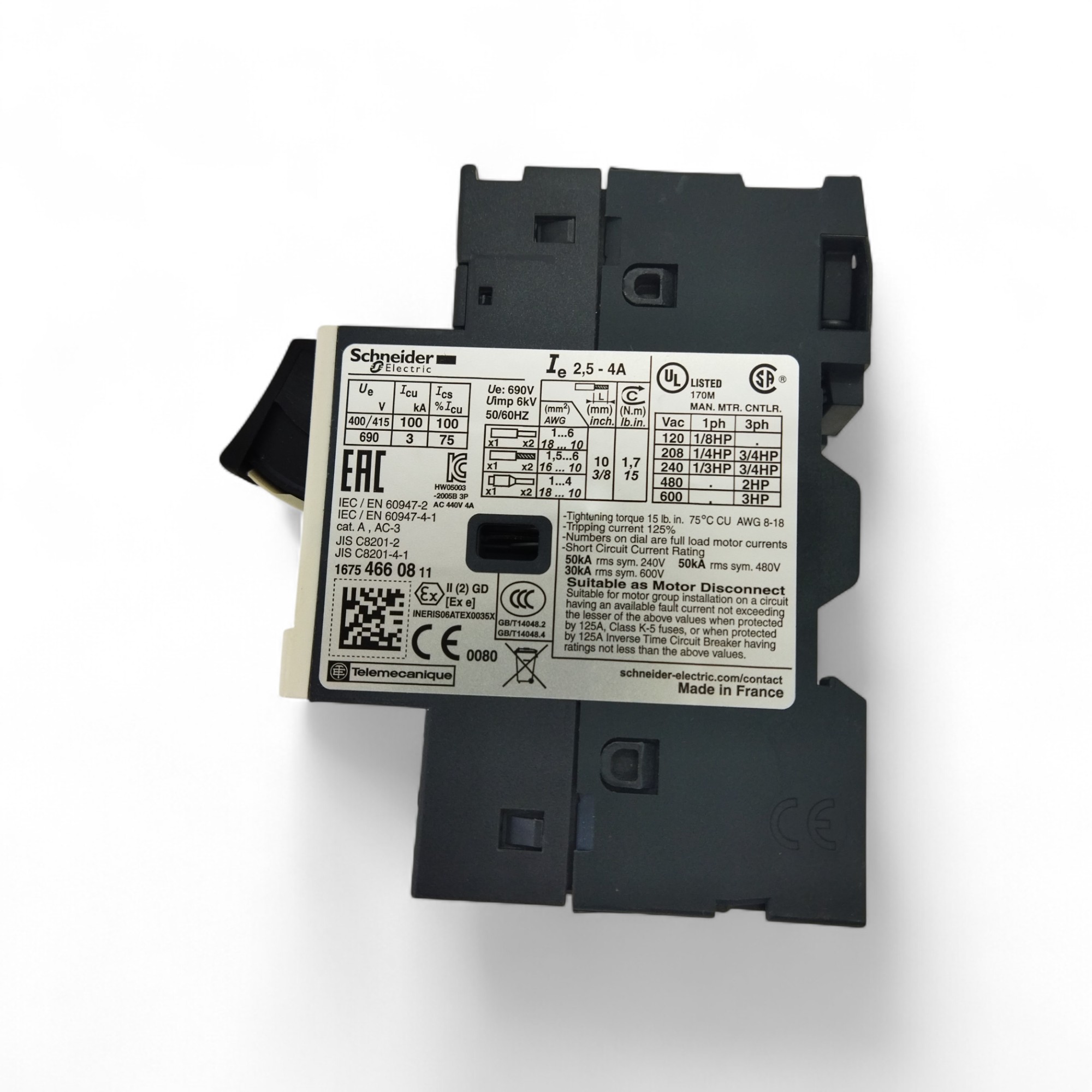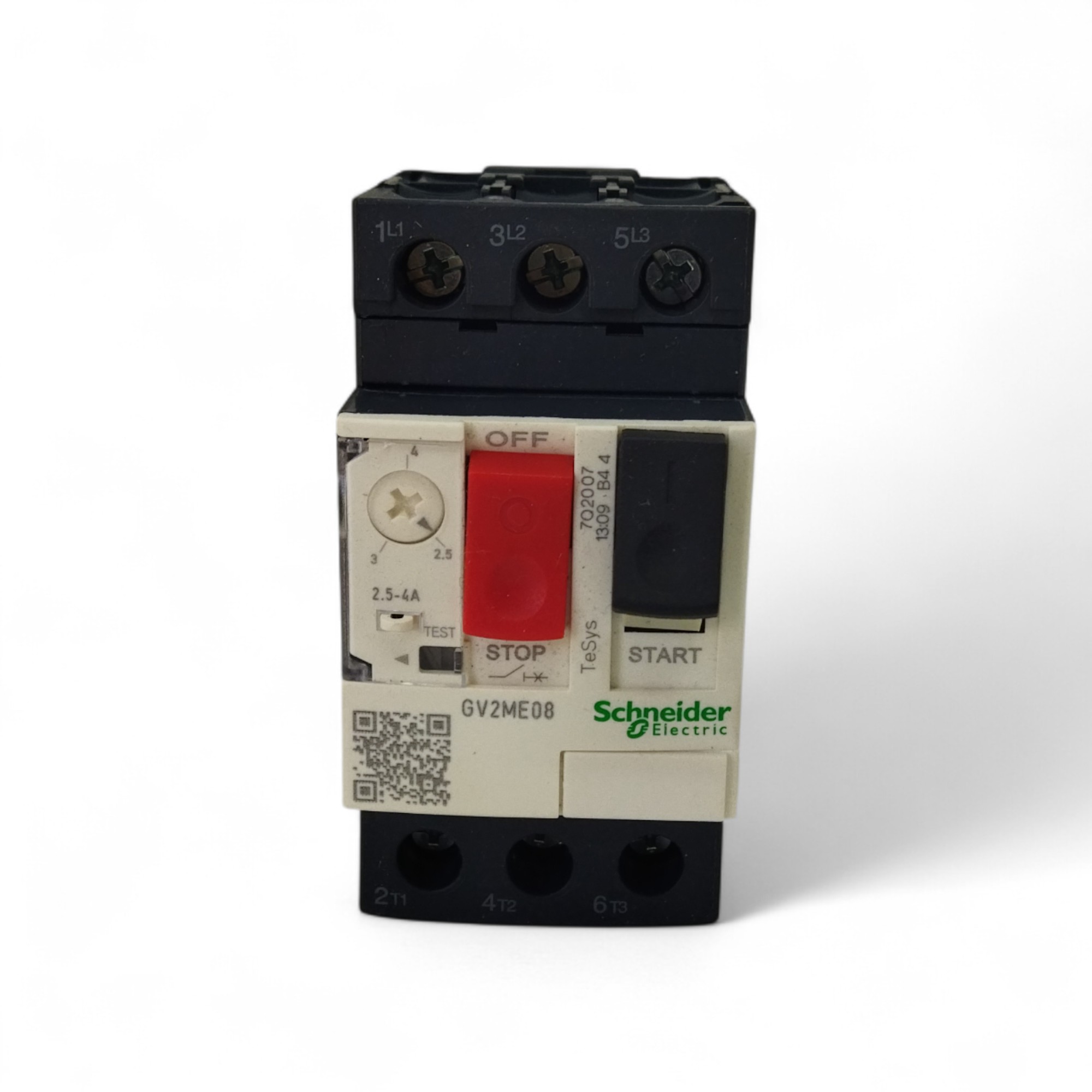 Автомат захисту двигуна Schneider GV2ME08 2,5-4A призначений для включення/відключення та захисту асинхронних електродвигунів 1,5кВт 380V змінного струму та захисту від струмів коротких замикань та перевантажень. Захист спрацьовує при перенавантаженні, обриву фази, затягнутого пуску та короткого замикання в колах змінного струму частотою 50Гц напругою до 400В.