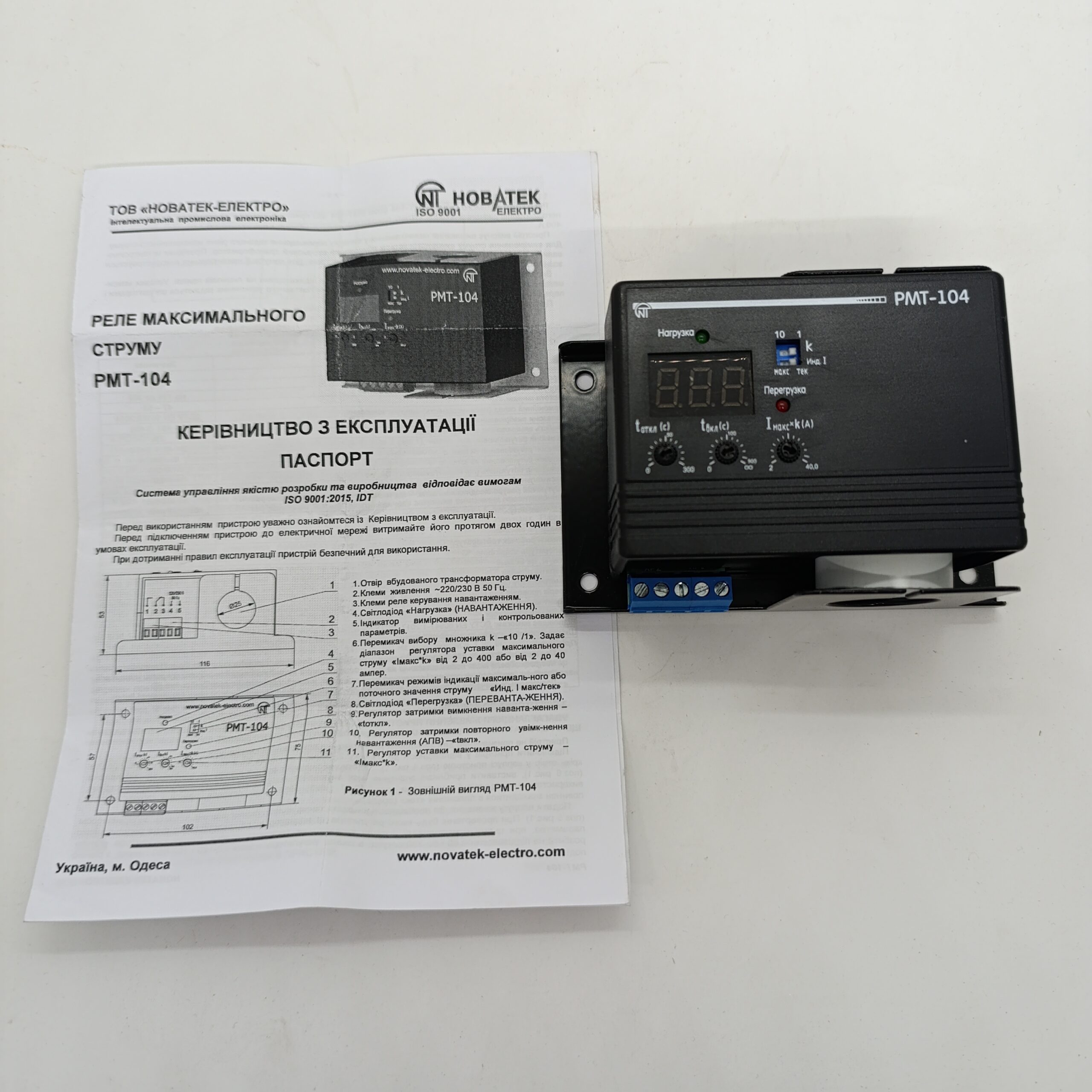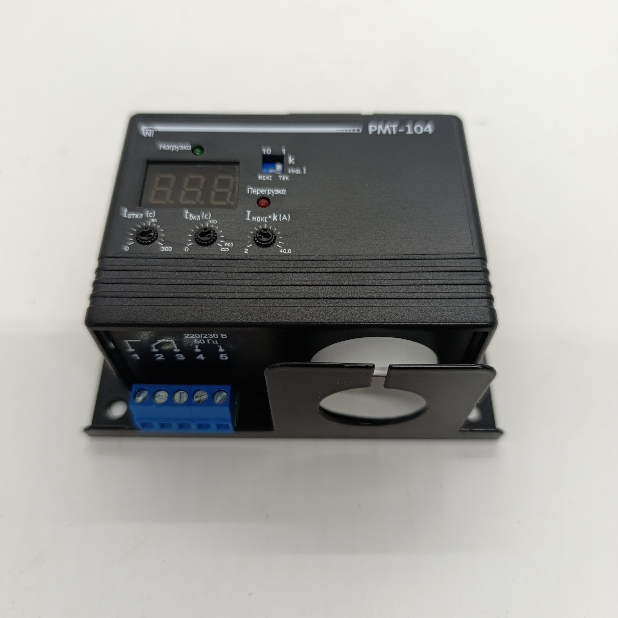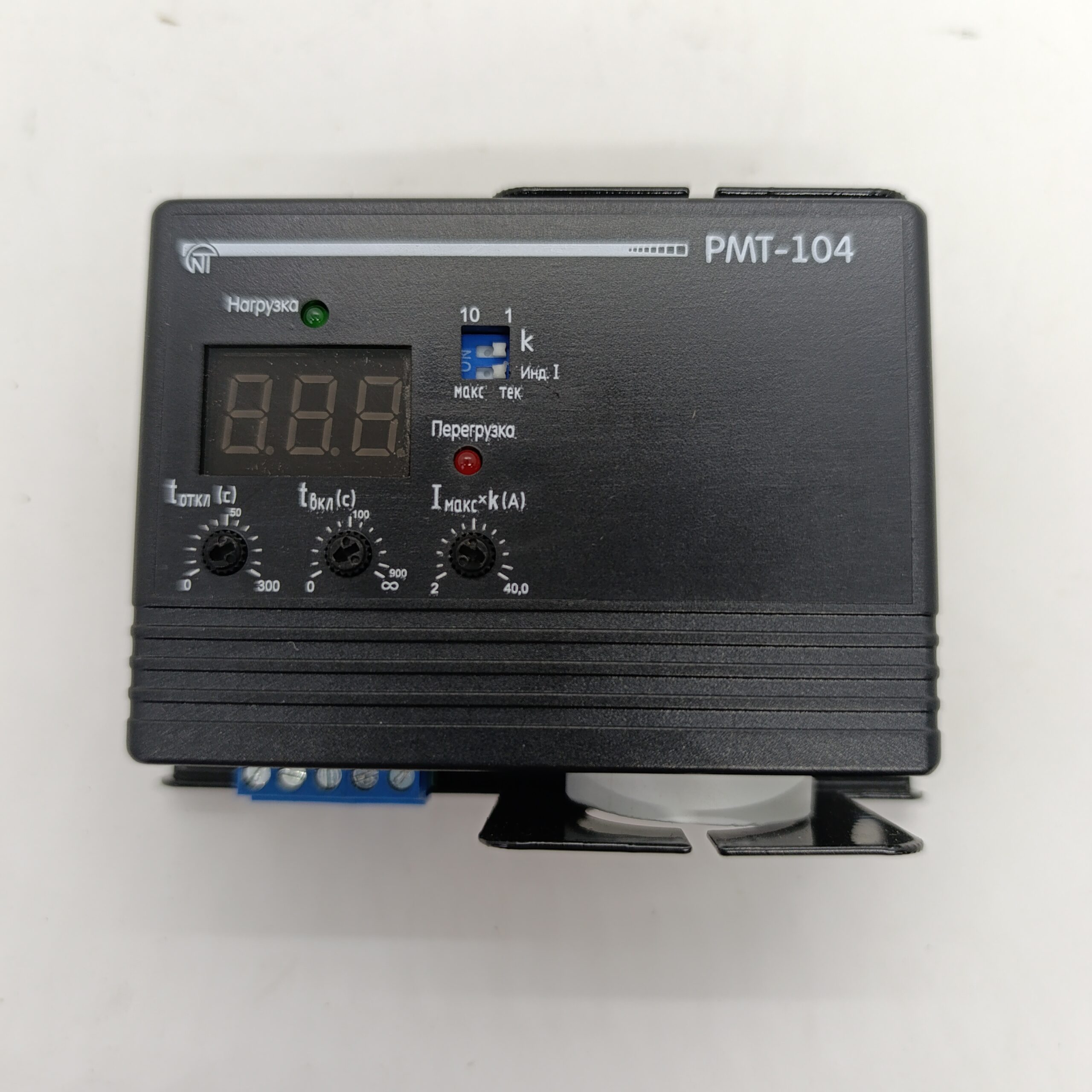Реле максимального струму РМТ-104 (RMT-104) Новатек призначене для постійного контролю діючого значення струму однофазного навантаження (у діапазонах від 0 до 40 А або від 0 до 400 А) і його відключення в разі перевищення заданого користувачем максимально допустимого струму навантаження (МТЗ з незалежною витримкою часу) із заданим часом відключення і подальшим автоматичним включенням до заданого часу включення або з блокуванням повторного включення.