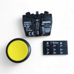 Кнопка, 22мм, кругла, пластикова, жовта, кнопка, плоска, 1 NO+1 NC, гвинтові клеми, з тримачем